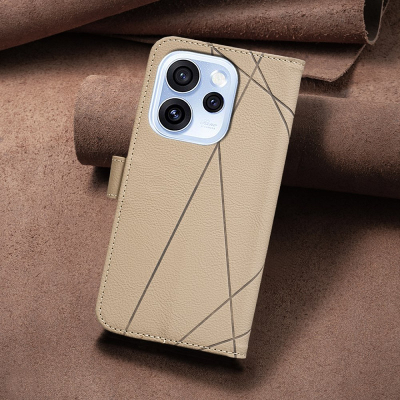 Protect your Oppo Reno 15 F 5G with this stylish wallet case. Modern geometric design, anti-fraud RFID blocking, 3 card slots and note compartment. Integrated foldable stand for hands-free viewing.