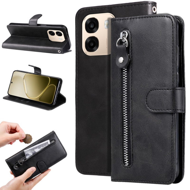 Étui multifonction élégant pour Oppo Reno 15 F 5G combinant protection intégrale et praticité. Comprend des emplacements pour cartes, une poche zippée sécurisée pour petits objets et un support pliable pour visionnage mains libres.