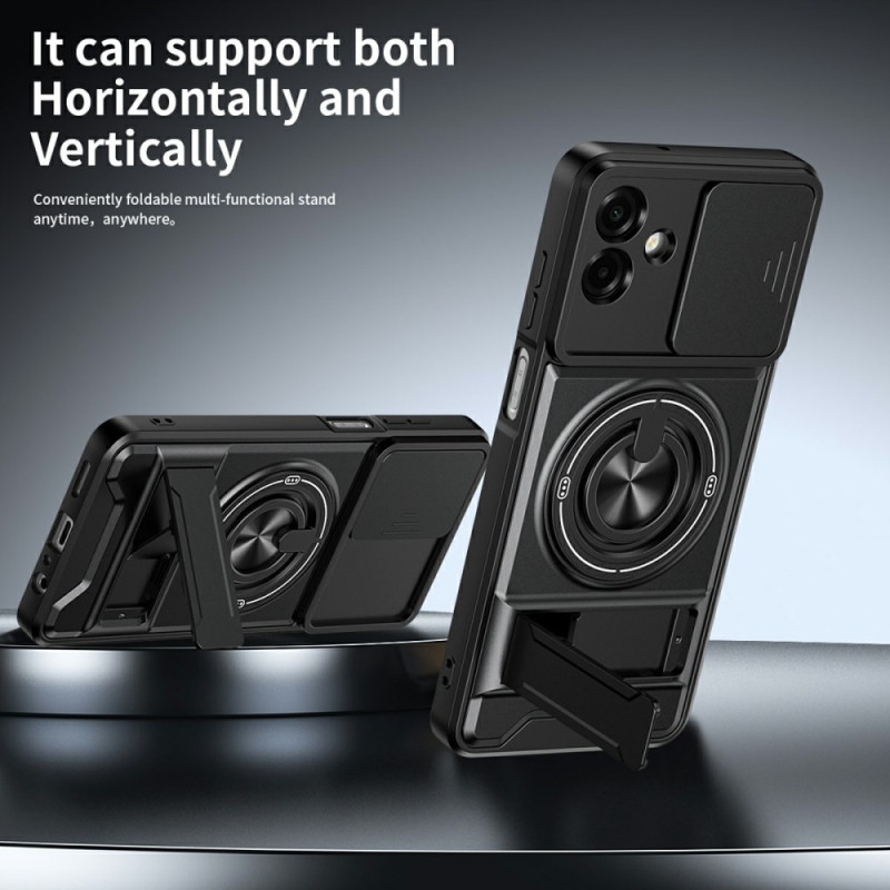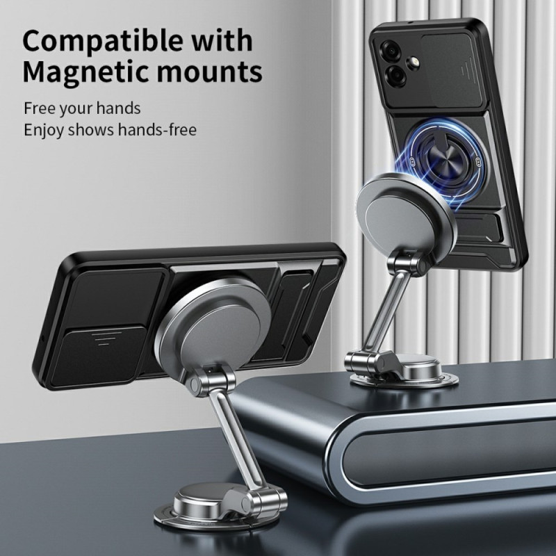 Protect your Samsung Galaxy A07 5G / 4G with this innovative magnetic case. Featuring a 360° rotating support ring, a foldable support for hands-free viewing and a sliding camera protection, it combines functionality with optimum security.