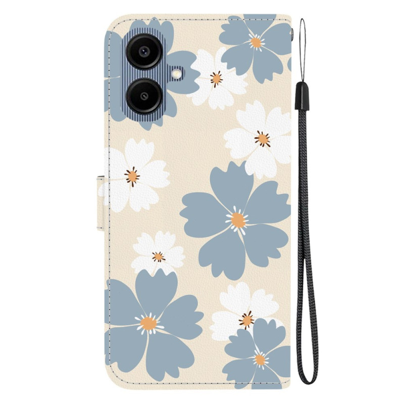 Stylish wallet case with blue daisy motif for Samsung Galaxy A07 5G / 4G / A06. Practical 2-in-1 design with foldable stand, integrated card holder and matching hand strap. Complete magnetic protection against everyday bumps and scratches.