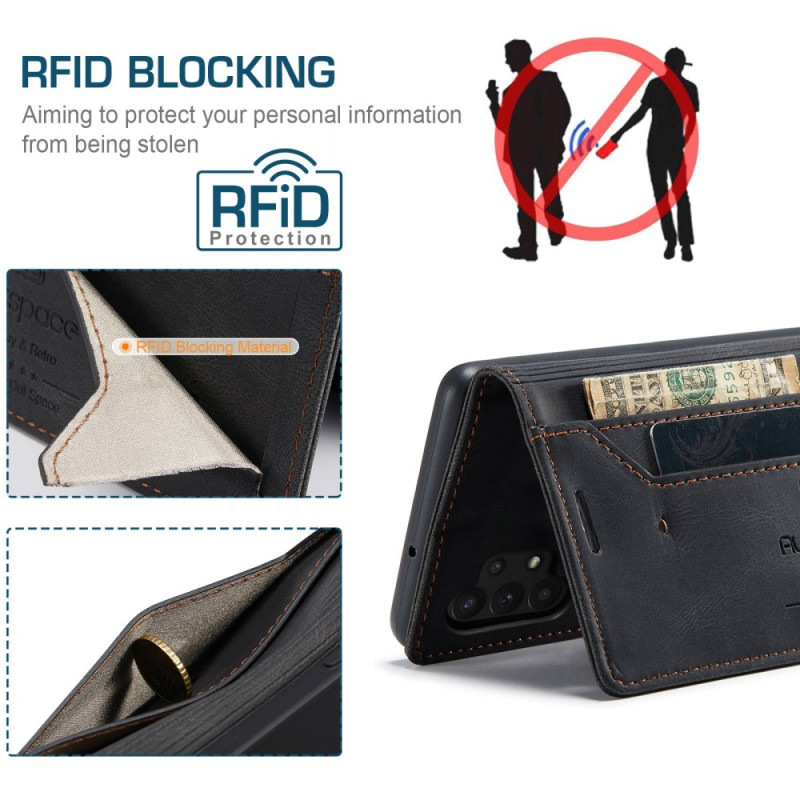 Discover the AUTSPACE A01 case for Samsung Galaxy A32 5G/M32 5G, combining protection and functionality. This vintage PU leather wallet features RFID blocking technology, card and cash slots, a stand function and a magnetic closure.