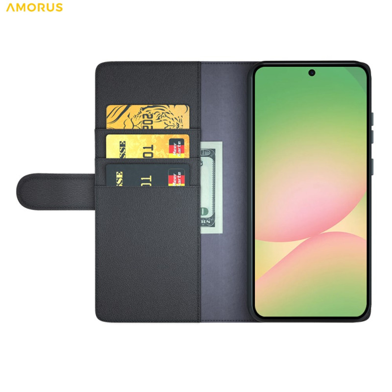 Genuine leather wallet case for Samsung Galaxy A57 5G. Elegant design with calf grain texture, integrated folding stand, 3 card slots and 1 banknote pocket. Full protection with secure magnetic closure.