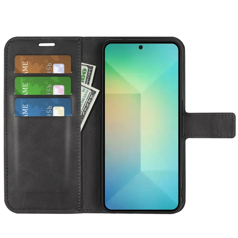 Its practical design includes a wallet with 3 card slots and a note compartment, as well as a foldable stand for comfortable viewing.