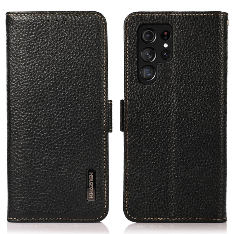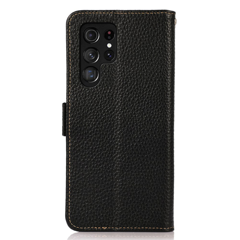 Sophisticated genuine leather case with lychee texture for Samsung Galaxy S26 Ultra. Enjoy advanced RFID protection, handy card slots and a convertible stand for viewing your content in total freedom.