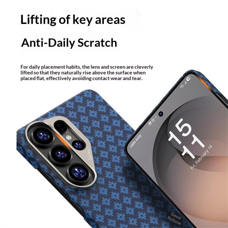 Protégez votre Samsung Galaxy S26 Ultra avec élégance grâce à cette coque magnétique BENKS en fibre d'aramide. Son design sophistiqué combine une protection robuste et un motif tissé tridimensionnel unique. Compatible avec les accessoires magnétiques.