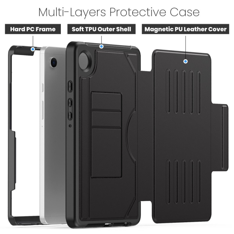 Discover our case for Samsung Galaxy Tab A11 Plus / A9 Plus, featuring a multi-layer protective structure, integrated card and pen slots, an automatic sleep function and a 5-level adjustable support.