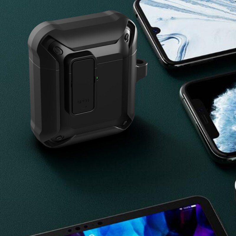 Upptäck det här ultra-resistenta fodralet med designerlås som ger optimalt skydd för dina AirPods 2 / 1 och levereras med en karbinhake.