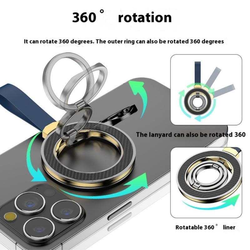 Denna roterande magnetiska hållare med ring kombinerar elegans, komfort och prestanda för att följa med din smartphone varje dag. Den är tillverkad av zinklegering med en mjuk silikonbeläggning och ger ett behagligt och säkert grepp. Det kraftfulla N52-magnetsystemet med 18 magneter ger ett stabilt grepp, perfekt för handsfree-användning eller som stöd. Ringen roterar 360° och lutar upp till 110°, så att du kan välja den mest bekväma vinkeln för att titta på video, ringa samtal eller skapa innehåll. Den är lätt och kompakt och passar perfekt med alla moderna smartphones.