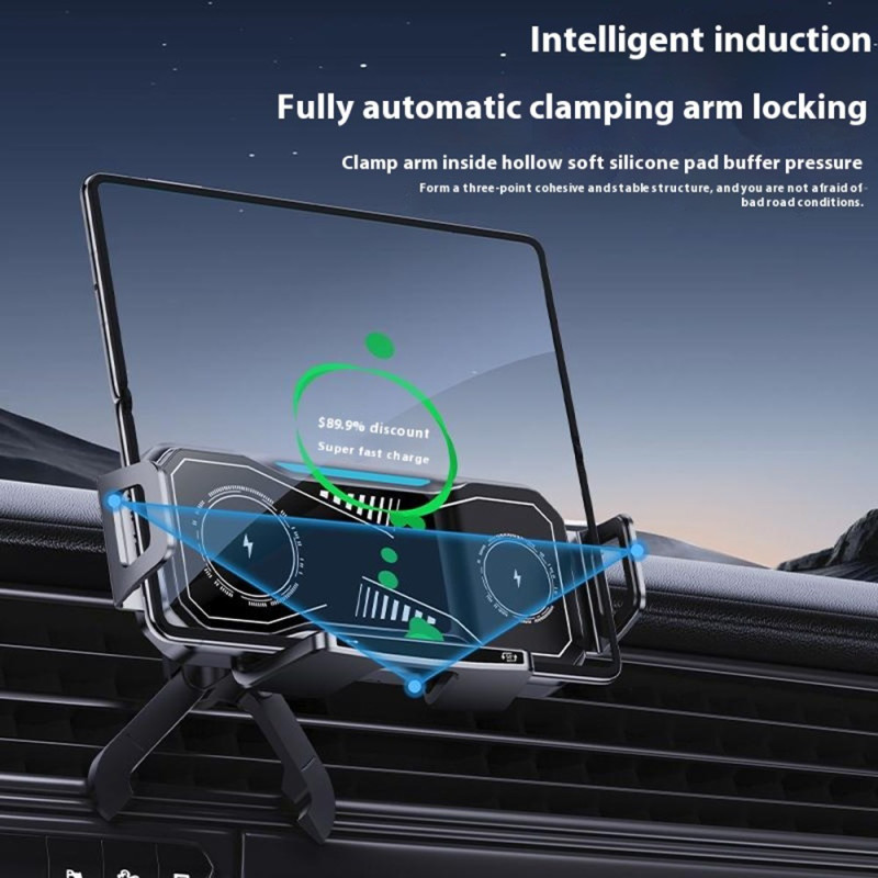 Förvandla din körupplevelse med denna innovativa trådlösa laddningshållare. Den är utrustad med två 15 W snabbladdningsspolar och är perfekt kompatibel med vikbara smartphones. Den integrerade stämningsbelysningen skapar en elegant atmosfär.