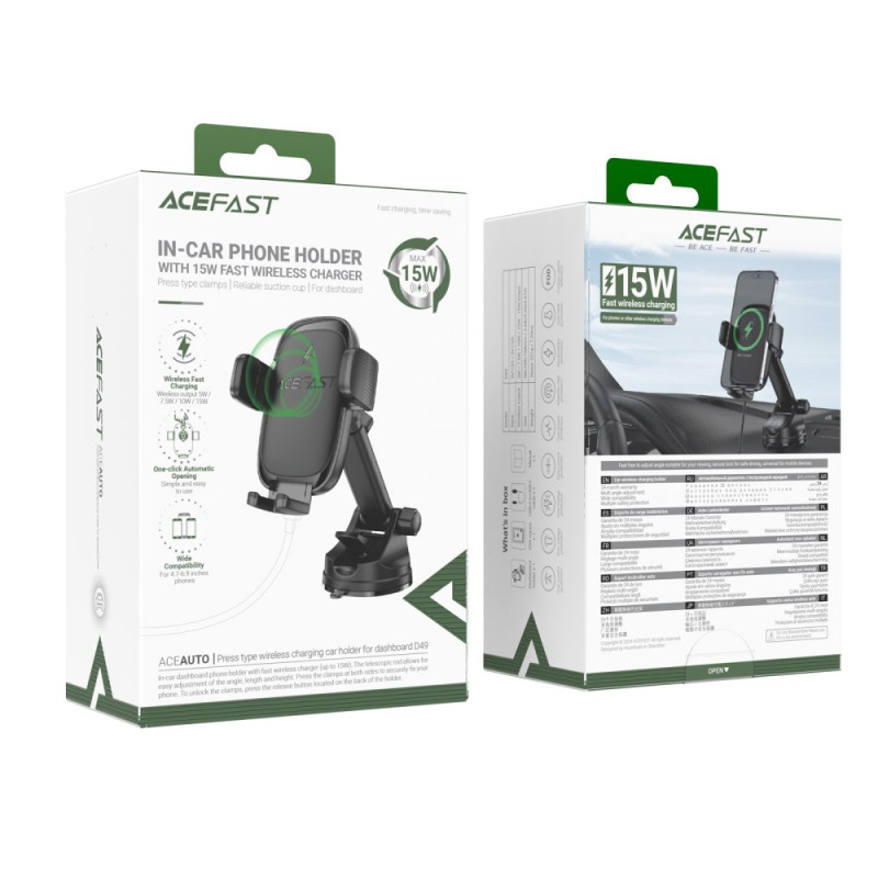 ACEFAST trådlös bilhållare med 15W snabbladdning. Säkert mekaniskt låssystem och omplacerbar sugkopp. Kompatibel med alla smartphones från 4,7 till 6,9 tum. Flexibel installation på instrumentbrädan eller vindrutan.