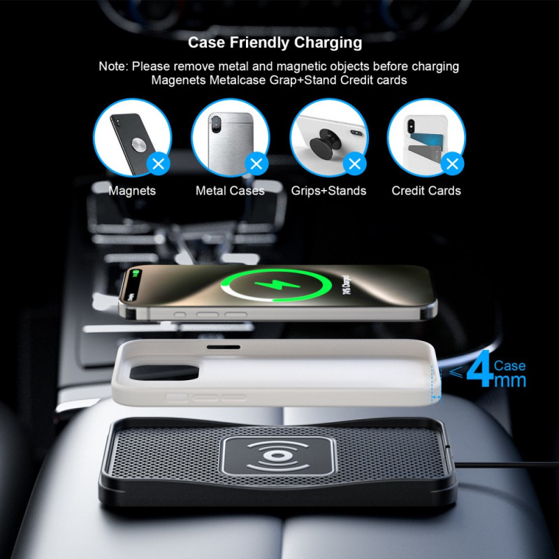 Trådlös billaddare med snabbladdning på upp till 20 W. Har en halkfri silikonplatta för att hålla telefonen säker under körning. Enkel att installera utan att modifiera fordonet, med 1 meter kabel.
