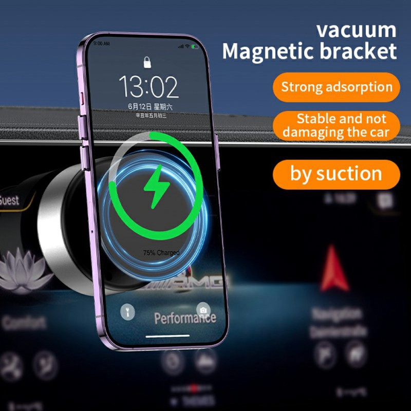 Upptäck det magnetiska bilfästet med snabb trådlös laddning på 15 W. Ultrasäkert fäste med vakuumsugkopp, 360° rotation för optimal betraktningsvinkel och kraftfulla N52-magneter för ett pålitligt grepp. Kompatibel med alla smartphones från 4,7 till 7 tum.