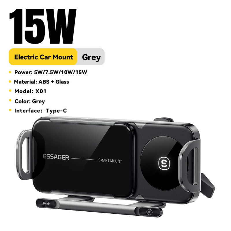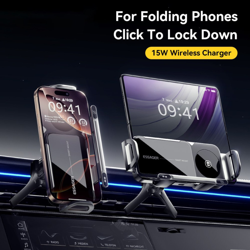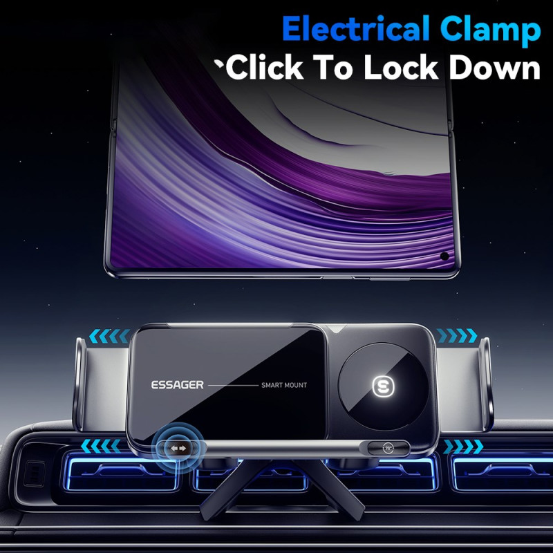 Upptäck ESSAGER telefonhållare med 15W trådlös laddare. Stabil triangulär design, enkel rotation, inbyggt 150mAh batteri för 500 cykler. Örnklor för säkert fäste på ventilationsgallret.