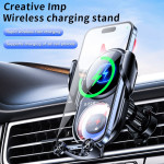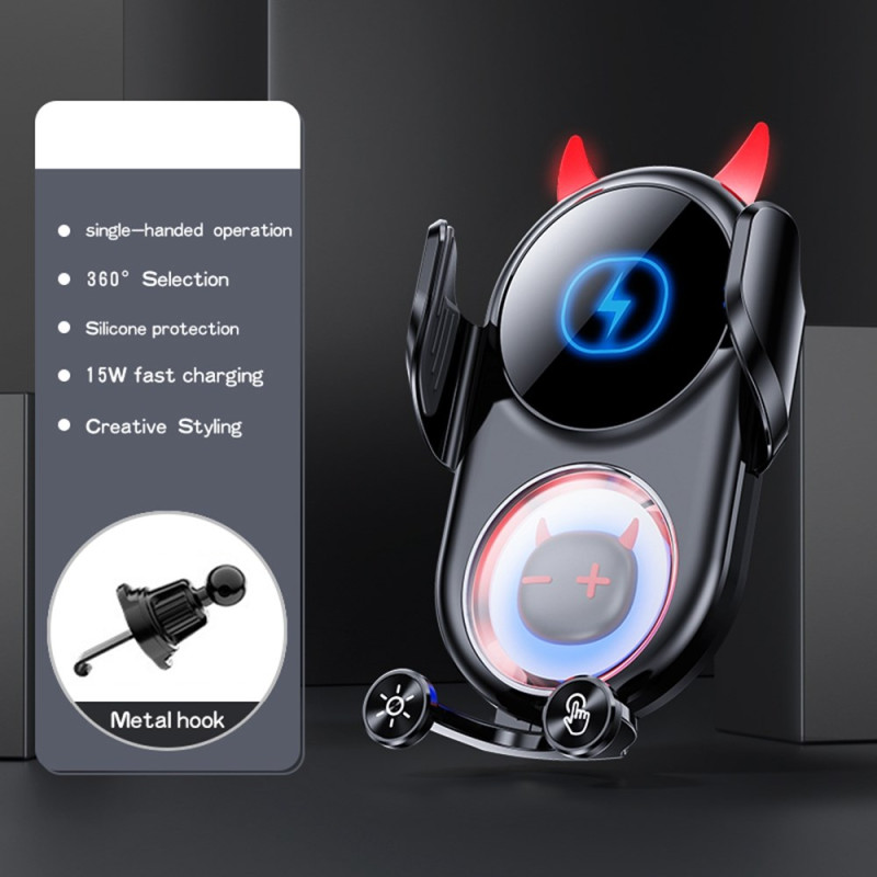 Snabb 15W trådlös laddare med luftventilationsfäste i Devil-design. Kompatibel med alla Qi-enheter (iPhone, Samsung, Huawei). Magnetisk teknik för omedelbar fastsättning och inbyggd stämningsbelysning.