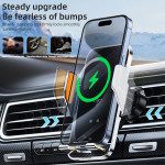 Ladda din telefon enkelt med den här innovativa bilhållaren. Med en snabb 15W trådlös laddare, 360° rotation och LED-humörbelysning kombinerar den prestanda och stil för din dagliga pendling.