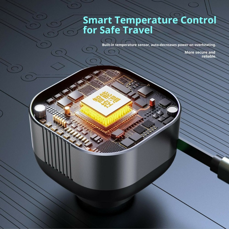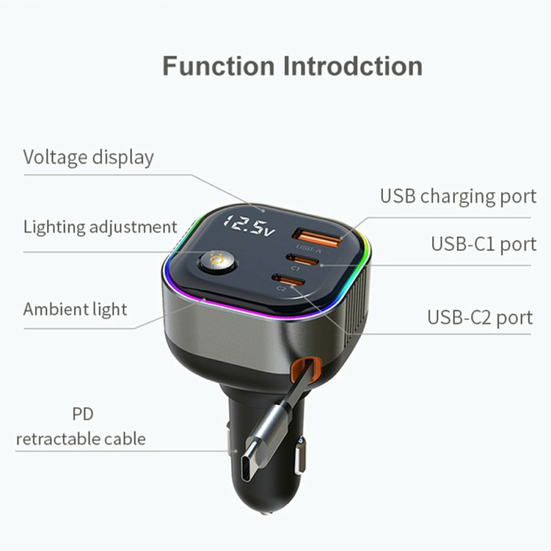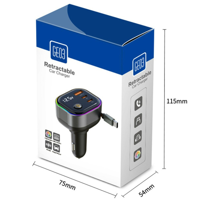 Découvrez le chargeur voiture GE03 avec charge rapide PD 65W et câble Type-C rétractable intégré. Équipé d'un écran d'affichage de tension en temps réel et d'un éclairage d'ambiance coloré, il offre plusieurs ports (USB-A et double USB-C) pour alimenter tous vos appareils simultanément en toute sécurité.