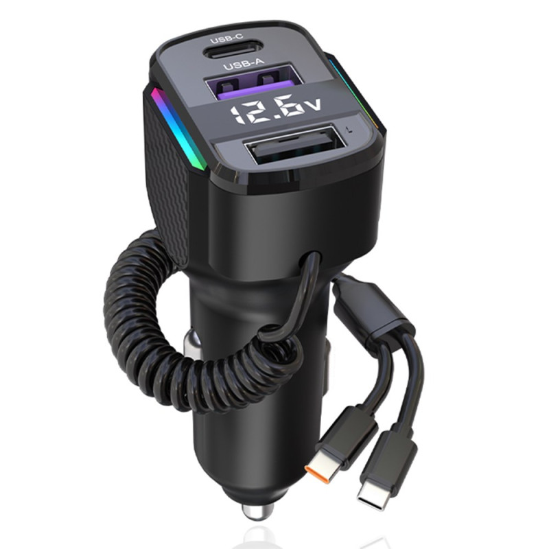 Högpresterande billaddare med 30 W PD-snabbladdning och 1,2 m Typ-C-spiralkabel. Färgat LED-ljus för enkel lokalisering i mörkret. Kompatibel med alla dina enheter: iPhone, Samsung, Xiaomi, Huawei och surfplattor.