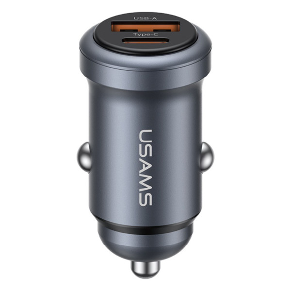 Ultrakompakt 30 W billaddare med dubbla USB-A- och USB-C-portar för snabb och mångsidig laddning. Dess miniatyrdesign och robusta konstruktion säkerställer optimal värmeavledning. Kompatibel med alla dina digitala enheter.