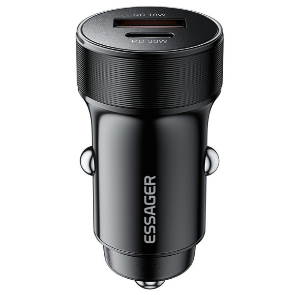 ESSAGER billaddare med PD 30W-teknik för ultrasnabb laddning. Dubbla USB-A- och Typ-C-portar med smart chip för optimal strömfördelning. Kompatibel med alla dina enheter.