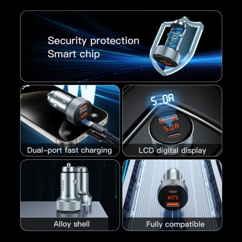 Ladda dina enheter på resande fot med TOTU CC-4 billaddare. Njut av 48W total effekt över två portar (USB-A 18W + Type-C 30W PD) för ultrasnabb, samtidig laddning av dina smartphones, surfplattor och bärbara datorer.