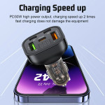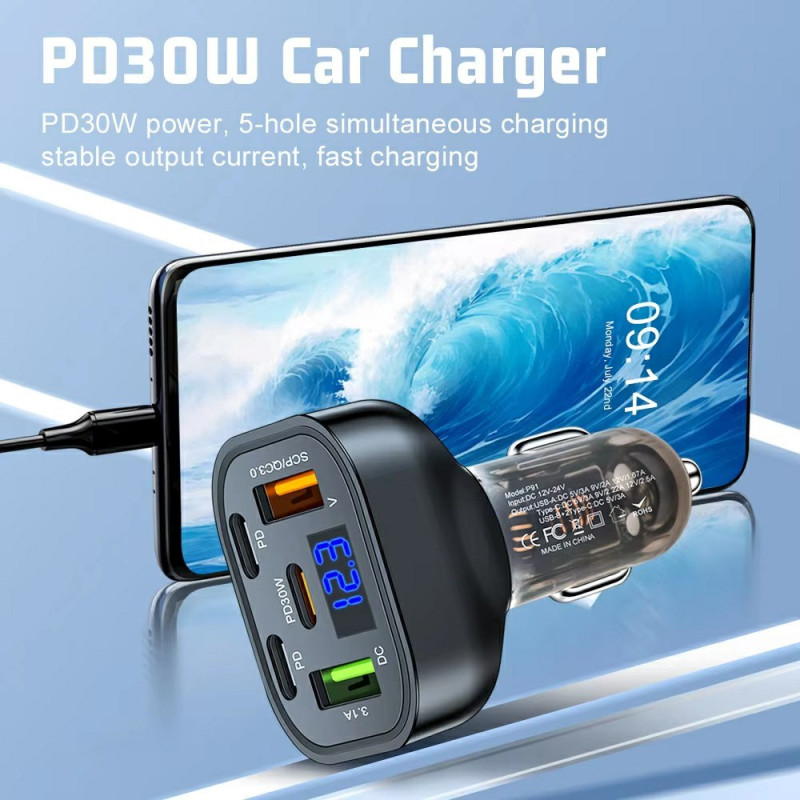 Högpresterande 150 W billaddare med 5 portar (3 Type-C + 2 USB) och QC3.0 PD snabbladdningsteknik. Med ett intelligent dubbelkärnigt chip och realtidsspänningsvisning för optimal laddning av alla dina enheter.