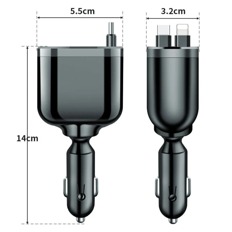 Högpresterande 5-i-1-billaddare med intelligent digital display. Ladda upp till 5 enheter samtidigt tack vare snabbladdande USB- och Type-C-portar. Integrerade utdragbara kablar för iPhone och typ C-enheter.