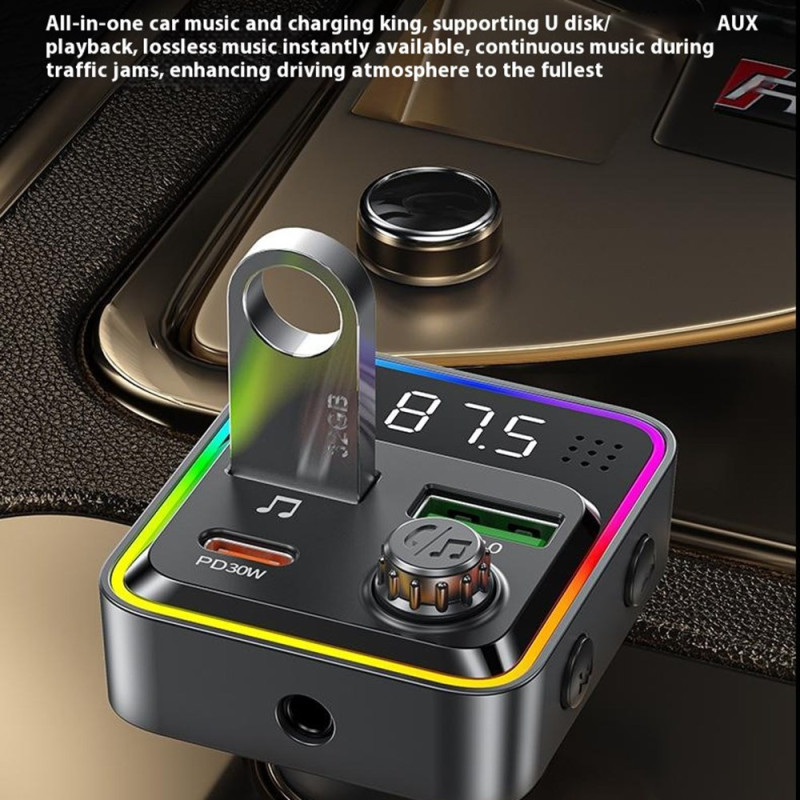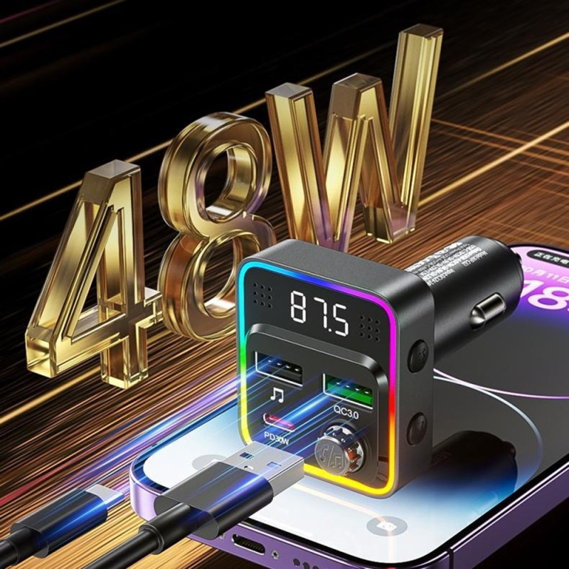 Intelligent 48 W billaddare med dubbla snabbladdningsportar (PD30W + QC3.0), integrerad MP3-spelare och 7-färgad omgivningsbelysning. Njut av handsfree Bluetooth-samtal och optimal laddning för alla dina enheter. Kompatibel med 12V-24V.