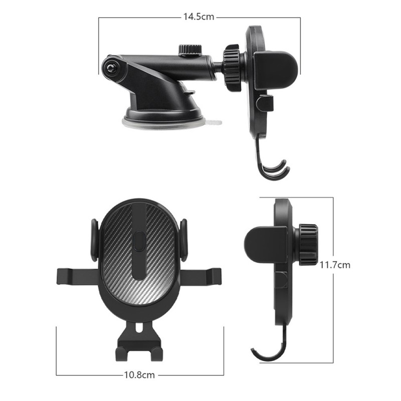 Universell biltelefonhållare med automatiskt låsningssystem. Sugkoppsfäste på vindrutan eller instrumentbrädan. Stabil triangulär struktur, 360° rotation, justerbar teleskoparm. Kompatibel med smartphones från 64 mm till 91 mm.