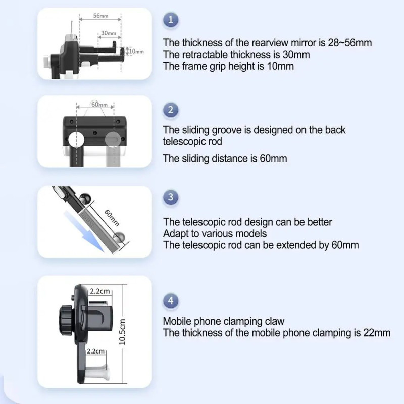 Telefonfästet H256 för backspegeln är en praktisk och säker lösning för att hålla din smartphone inom räckhåll under körning. Den justerbara teleskoparmen och 360° vridningen gör att du kan ställa in den perfekta vinkeln för navigering, utan att skymma sikten. Den är utformad med en antireflexklämma och silikonbeläggning som skyddar spegeln samtidigt som den ger ett stadigt och stabilt grepp. Den är lätt och enkel att installera tack vare stålkabeln, passar de flesta backspeglar och håller din telefon säkert på plats för en smidigare och säkrare körning.