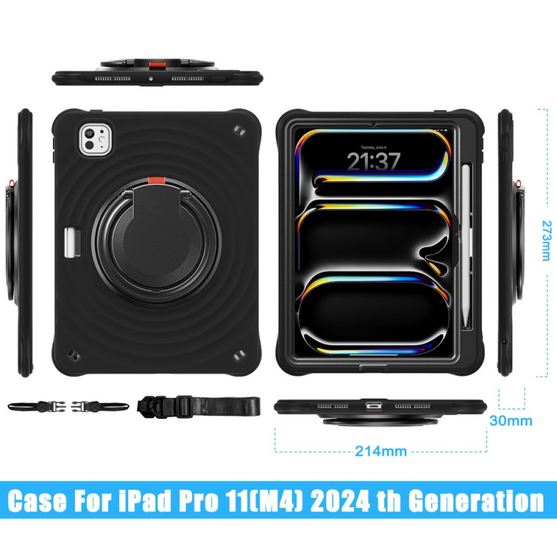 Detta robusta fodral för iPad Pro 11 (2025) / 11 (2024) erbjuder överlägset skydd med sin hybriddesign. Det har ett 360° roterande stativ, pennfack, stötdämpande design och roterande handtag. Perfekt för både arbete och fritid och levereras med en justerbar axelrem för enkel bärning.