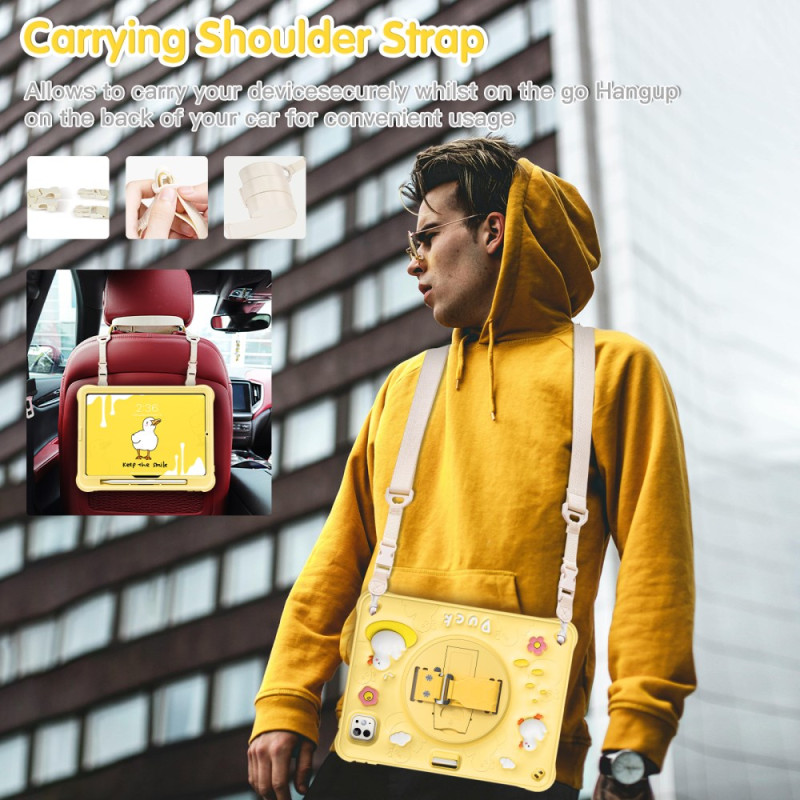 Upptäck vårt innovativa fodral för iPad Pro 11, som kombinerar skydd och stil. Med ett praktiskt stativ, avtagbar axelrem och en bedårande anka-design, erbjuder det skydd i flera lager med förstärkta hörn. Det 360° roterande handtaget ger ett bekvämt grepp, perfekt för daglig användning.