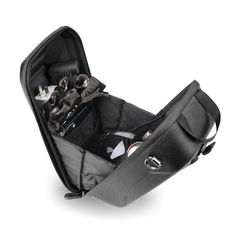 Denna väska är utformad för en sömlös övergång mellan elskoter och kontor och är den modulära förvaringslösningen. Det hårda EVA-ytterhöljet ger stötskydd mot skal och stötar. Adaptersystemet med dragkedja möjliggör snabb montering och borttagning från styret. Bärremmen och axelremmen gör det enkelt att förvandla den till en pendlarväska. Interiören är organiserad i flera fack för effektiv separation av dina tillhörigheter, med en infällbar nyckelring för omedelbar åtkomst. Den fästs säkert med ett universellt system med tre remmar.