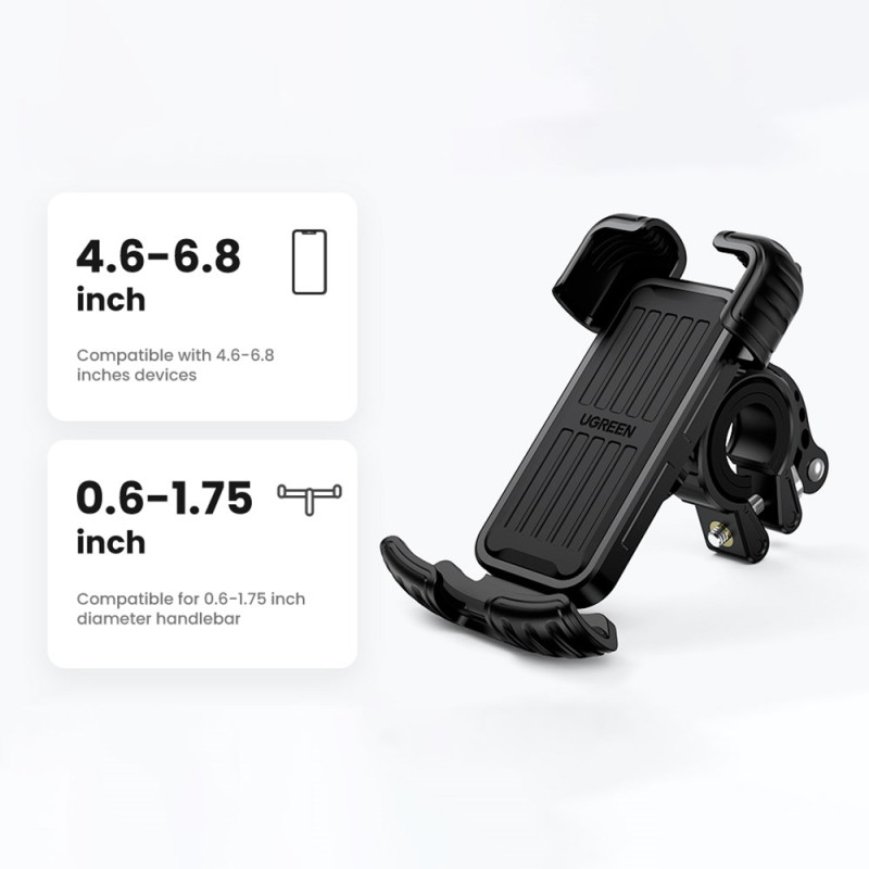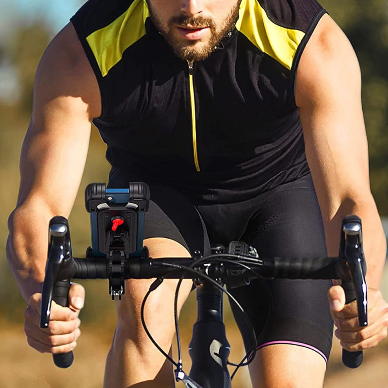Den 360-gradiga justeringsfriheten och enhandskontrollen ger säker navigering för alla typer av tvåhjulingar. Denna universella hållare säkrar smartphones från 4,6 till 6,8 tum tack vare en dubbel låsmekanism som håller metallförseglingarna stadigt på plats. Silikonbeläggningen absorberar stötar och skyddar telefonen från repor. Skruvfästet är enkelt och passar styren från 15 till 44,5 mm, vilket täcker motorcyklar, elcyklar och barnvagnar. Full rotation garanterar alltid optimal betraktningsvinkel, även under körning.