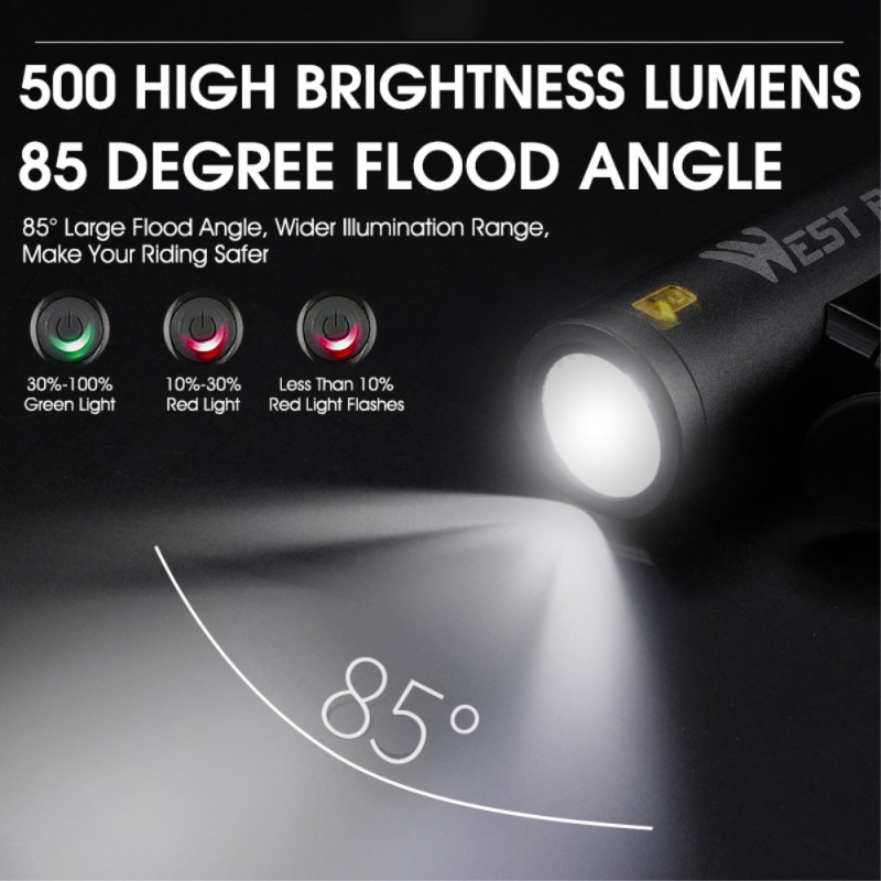En betydande förbättring av säkerheten nattetid garanteras av kombinationen av 500 lumen och vidvinkelbelysning. Frontljuset använder en T6 LED för att ge en ljuskägla på 200 meter med 85 graders täckning. Höljet i matt aluminium är utformat för maximal styrka och hållbarhet. Det integrerade 2000mAh-batteriet ger lång drifttid och minimerar antalet laddningar. Enheten är IPX5-certifierad, vilket garanterar att den är väderbeständig. Fem olika belysningslägen finns tillgängliga, vilket gör den lämplig för alla cykelmiljöer.