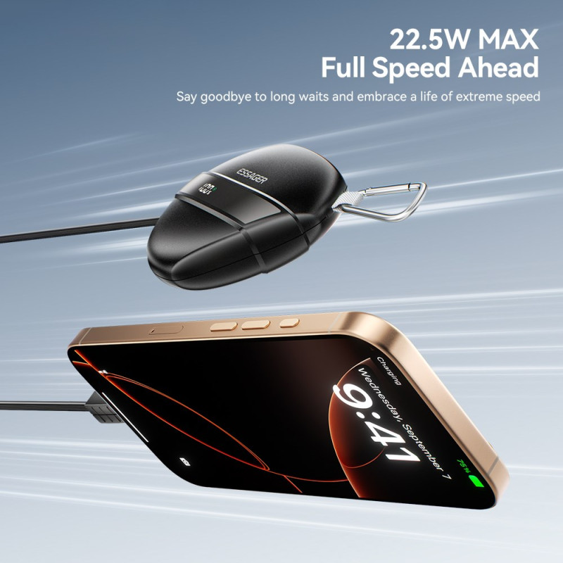 Att eliminera logistiska begränsningar och upprätthålla en snabb laddning är målen för detta ESSAGER externa batteri som är utformat för aktiv rörlighet. Med en kapacitet på 10000 mAh ger det den autonomi som behövs för dagliga resor eller korta utflykter. Dess maximala uteffekt på 22,5 W garanterar ultrasnabb laddning. Den integrerade 70 cm långa infällbara kabeln gör att du slipper krångla med den, medan karbinhaken gör att du kan fästa den säkert i en väska eller ett bälte. Dess intelligenta chip optimerar laddningseffektiviteten. Enheten är CE- och RoHS-certifierad, vilket visar att den överensstämmer med europeiska bestämmelser.