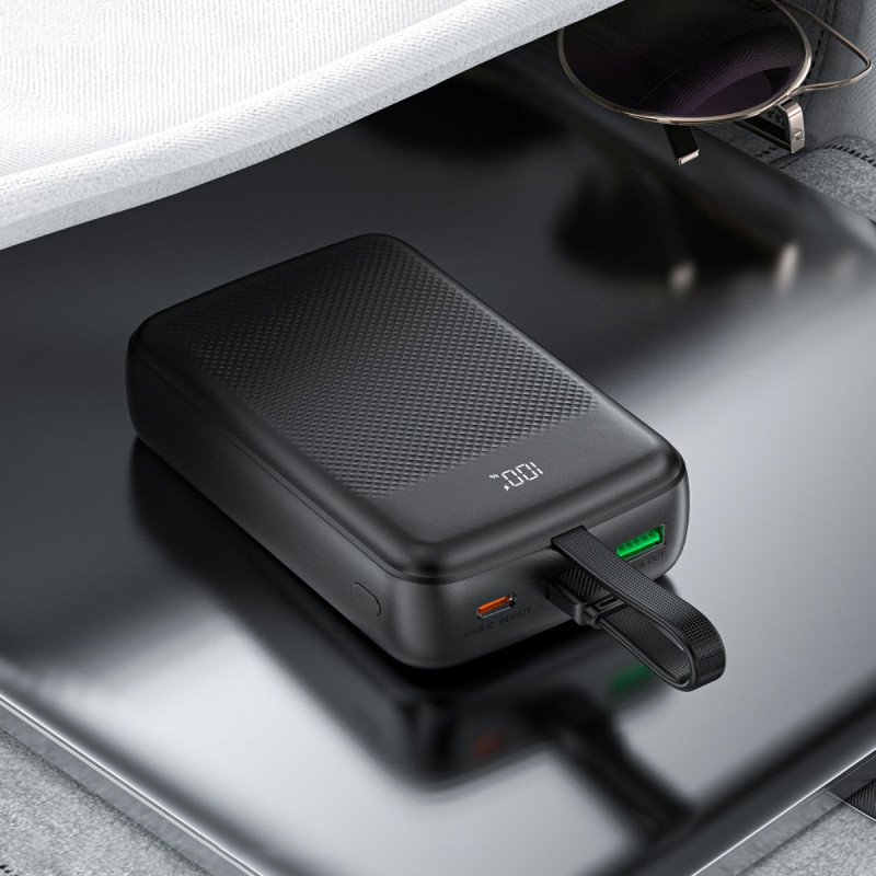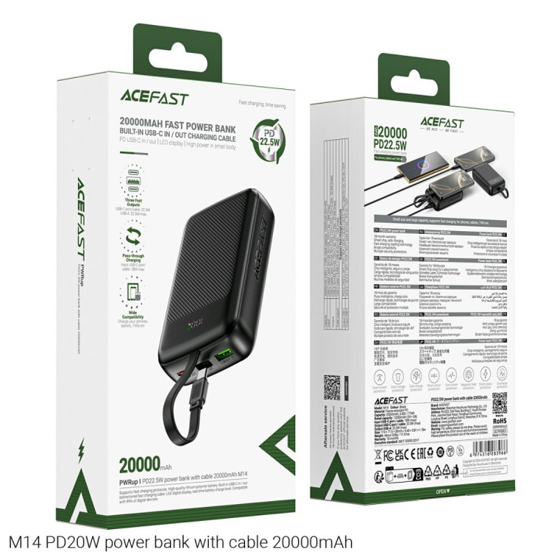 Detta externa ACEFAST 20000mAh-batteri erbjuder generös autonomi och kan ladda flera enheter när du är på resande fot under långa perioder. Dess kompatibilitet med 22,5W snabbladdning via USB-C och USB-A säkerställer effektiv strömförsörjning för många smartphones och tillbehör. Den integrerade Type-C-kabeln förenklar användningen genom att eliminera behovet av att bära med sig extra kablar. Den digitala displayen visar den exakta energinivån och den flamskyddade PC-designen i kombination med koboltceller garanterar ökad säkerhet. Den är certifierad för flygtransport och är perfekt för resenärer.