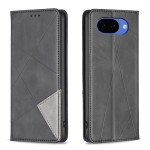 Elegant läderfodral till Google Pixel 10A med raffinerat geometriskt mönster. Har integrerade fack för bankkort och ID, ett stativ för handsfree-visning och en säker magnetisk stängning.