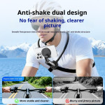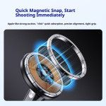 Upplevelsen av att skapa uppslukande innehåll och ringa hands-free videosamtal förbättras med detta innovativa magnetfäste. Det här fästet är utformat för POV och har en magnetisk mekanism med snabbkoppling för enkel montering och demontering. Den flerdimensionella justeringen (360° + 240°) gör att du kan få den perfekta betraktningsvinkeln för alla scenarier (vlogging, surfning, visning). Den mjuka, halkfria silikonkonstruktionen garanterar maximal komfort, även när den bärs under långa perioder. Anti-chocksystemet garanterar att enheten (över 4,7 tum) står stadigt även vid måttlig fysisk aktivitet.