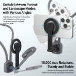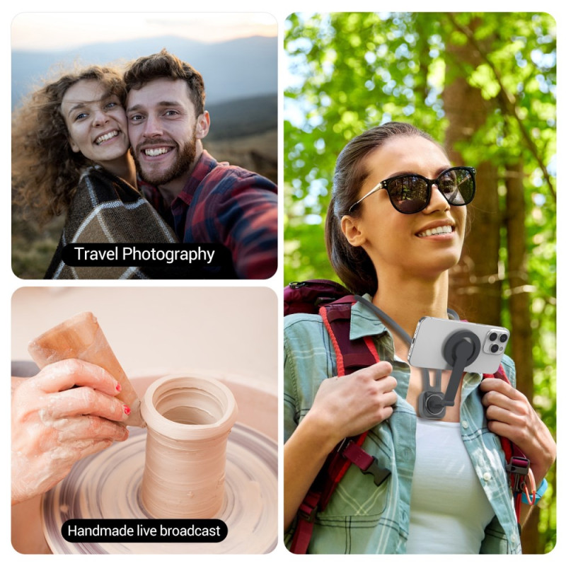 Att se till att dina videosekvenser löper smidigt och skakfritt är det primära syftet med den här nya generationens POV-fäste. Den sömlösa interna strukturen i metallegering säkerställer en styv bas. Enheten har dubbel stabilisering: en luftkuddad bas för att absorbera stötar och en stötdämpande pivot för att motverka oönskade rörelser. Det magnetiska greppet är extremt kraftfullt (MagSafe-kompatibel). Den 360-gradiga rotationen gör att du kan justera betraktningsvinkeln exakt, vilket gör detta stativ till ett oumbärligt verktyg för innehållsskapare på resande fot.