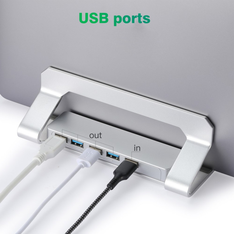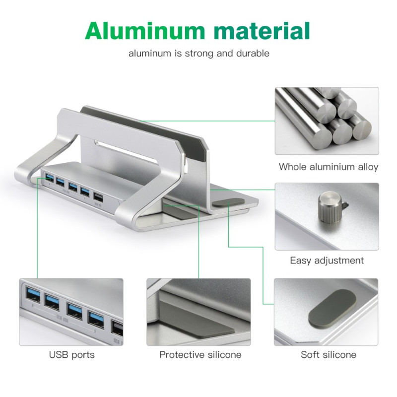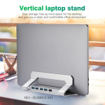 Att effektivisera arbetsytan och integrera anslutningsmöjligheter är de största fördelarna med denna vertikala organisatör. Stativet är tillverkat av en hållbar aluminium och är utformat för att hålla din bärbara dator (upp till 17,3") i upprätt läge, vilket frigör värdefullt skrivbordsutrymme. Den integrerade USB 3.0-hubben med 4 portar gör det enkelt att ansluta kringutrustning och optimera kabelhanteringen. Breddjustering (7 mm till 21 mm) sker verktygsfritt med hjälp av en räfflad ratt. Silikonkuddar skyddar enheten från repor.