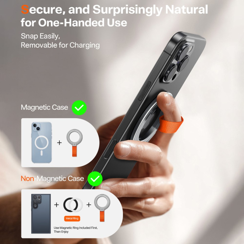 Ett säkert grepp och handsfree-positionering är de främsta funktionerna hos denna magnetring från TORRAS. Den är tillverkad av rostfritt stål med ett bekvämt nylonhandtag och minskar avsevärt risken för att tappa enheten. Mekanismen innehåller kraftfulla magneter för säker och omedelbar fastsättning på MagSafe-kompatibla skal eller enheter. Ringen roterar 360 grader, så att du kan justera betraktningsvinkeln för videovisning eller selfies. Den vikbara designen gör den idealisk för fickförvaring utan att ta upp för mycket utrymme.