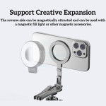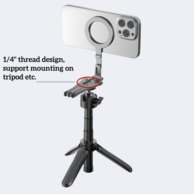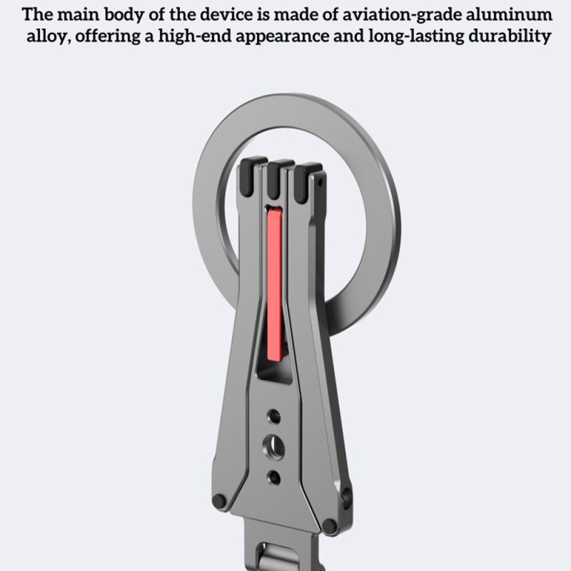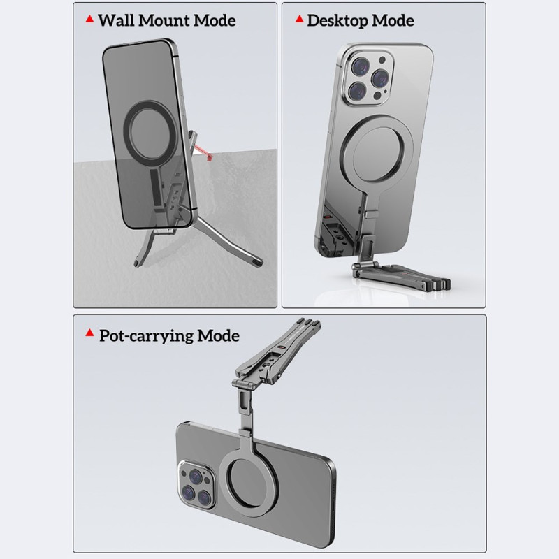 Denna magnetiska hållare är ett vikbart stativ som är utformat för att ge en mångsidig och ultra-praktisk handsfree-upplevelse. Den är kompatibel med iPhone 12 till 16 tack vare direkt magnetisk vidhäftning eller MagSafe-skal och kan även användas för andra smartphones via den medföljande magnetringen. Den är tillverkad av en stark och lätt aluminium och har kraftfulla aluminium-järn-boron-magneter för ett säkert grepp. Kompakt i hopfällt läge (117 × 58 × 10,65 mm) och med en vikt på endast 60 g kan det användas som stativ, skrivbordsstativ eller lutningsstativ, beroende på dina behov.