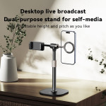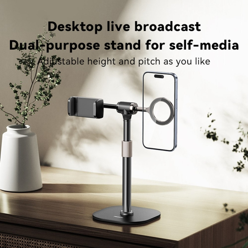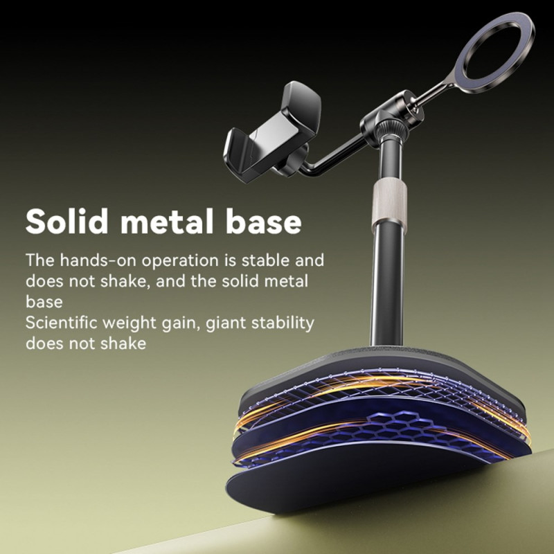 Detta justerbara skrivbordsstativ för två telefoner är perfekt för streaming, multitasking och professionella videokonferenser. Det är tillverkat av högkvalitativ metall, PC, ABS och POM och erbjuder exemplarisk stabilitet tack vare sin robusta legeringsbas. Den kraftfulla N52-magneten möjliggör direkt och säker fastsättning av iPhone 12 till 16, medan den extra klämman rymmer smartphones från 4,7 till 6,5 tum. Den höjdjusterbara armen och 360° sviveln ger total flexibilitet, vilket gör det enkelt att växla mellan horisontellt och vertikalt läge efter behov.