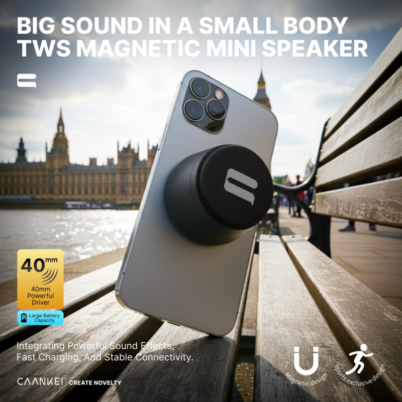 Upptäck den bärbara högtalaren CWS06 med innovativ magnetisk infästning. Den är kompakt och ultralätt (77 g) och har IPX6-vattentäthet, perfekt för dina utomhusäventyr. Njut av ett kraftfullt 3W-ljud och 3 timmars batteritid tack vare det långlivade batteriet...