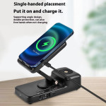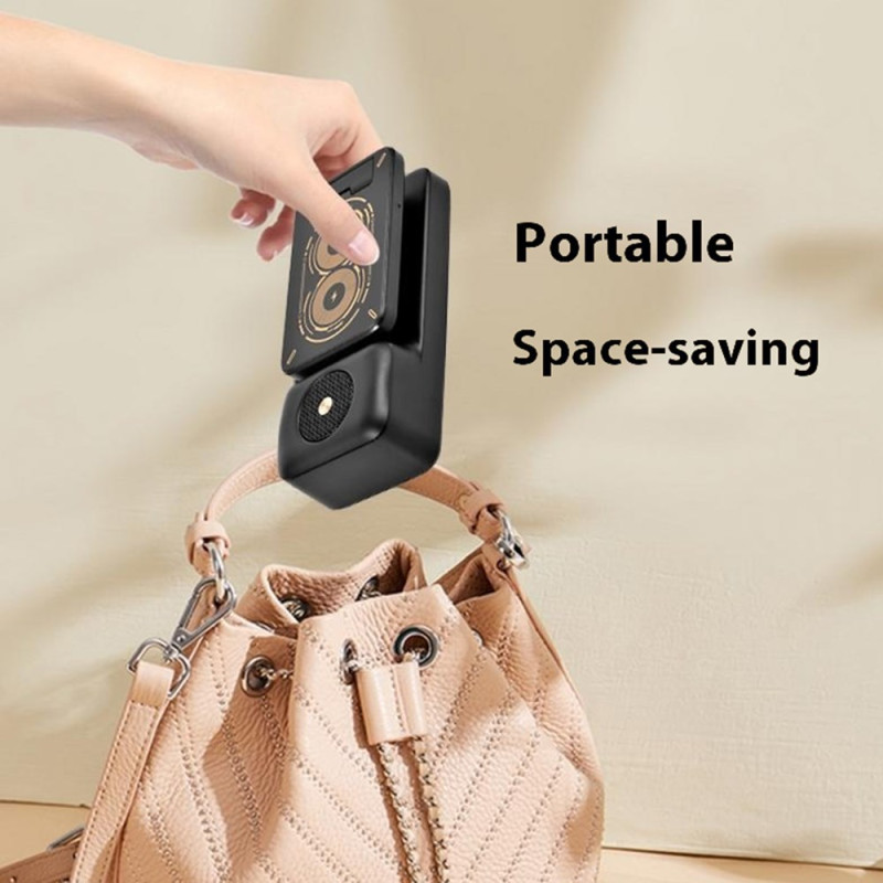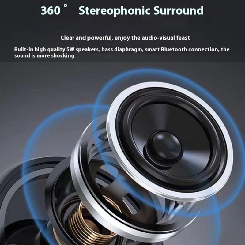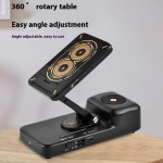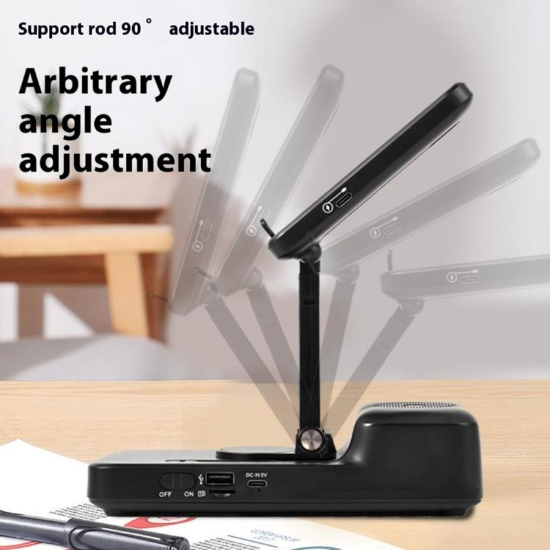 Support ajustable 3-en-1 alliant enceinte Bluetooth 5.1, chargeur sans fil et station d'accueil ergonomique. Design pliable avec rotation 360°, haut-parleurs double aimant 5W et batterie intégrée de 1500mAh. Parfait pour le bureau ou les déplacements.