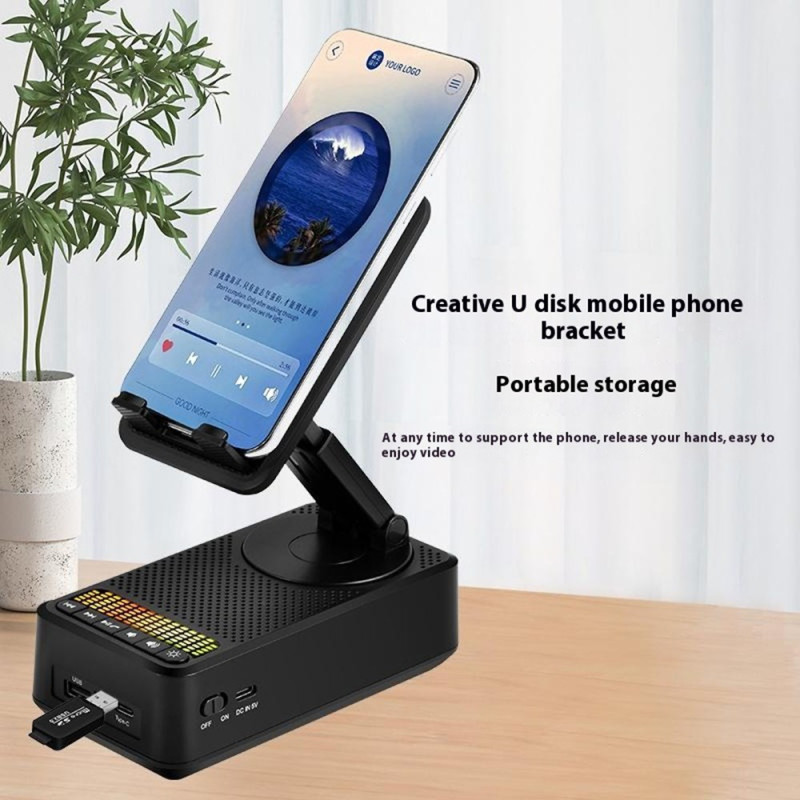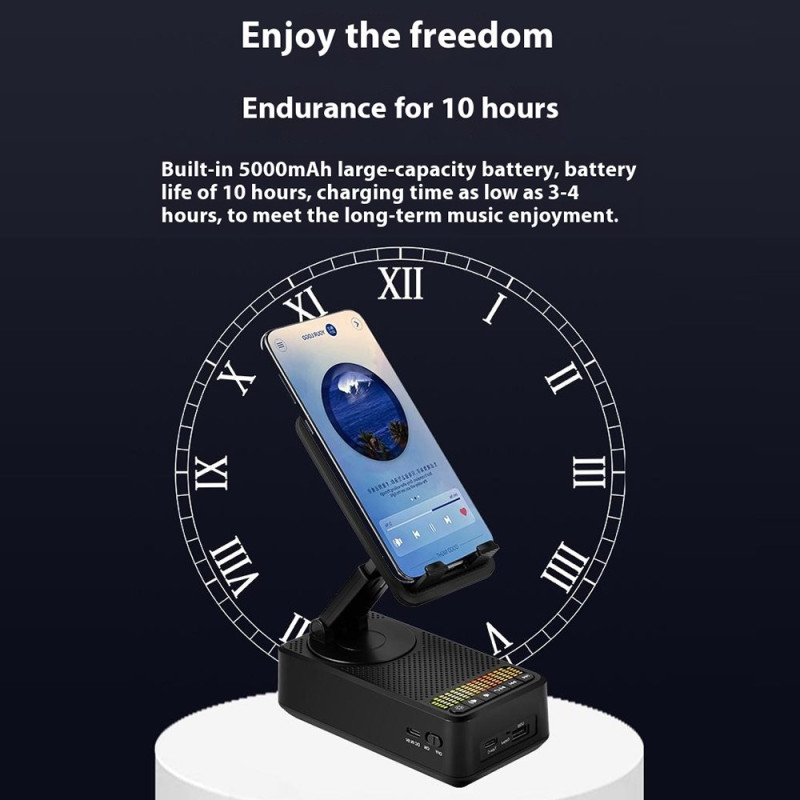 Upptäck 3-i-1-hållaren: en 360° justerbar hållare för smartphones och surfplattor, en kraftfull 5W Bluetooth-högtalare och ett 1500mAh externt batteri. Ultrakompakt vikbar design med integrerad stämningsbelysning, perfekt för hemmet, kontoret eller resan.