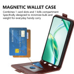 Vertikalt klafffodral i premium PU-läder för Honor 200 Smart 5G / X7c 4G. Praktisk design med nedåtriktad öppning för användning med en hand, integrerad kortplats och säker magnetisk stängning.