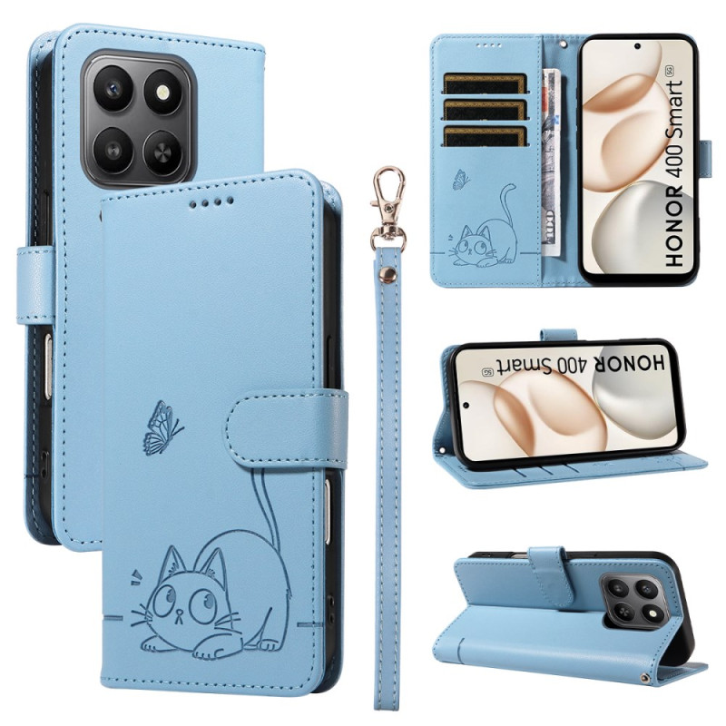 Upptäck vårt multifunktionella plånboksfodral för Honor 400 Smart 4G. Med tre kortplatser, en pengaficka och en säker magnetisk stängning kombinerar detta fodral praktisk funktion och skydd. Dess eleganta design med kattmotiv och avtagbar handledsrem gör det till det perfekta tillbehöret till din smartphone.