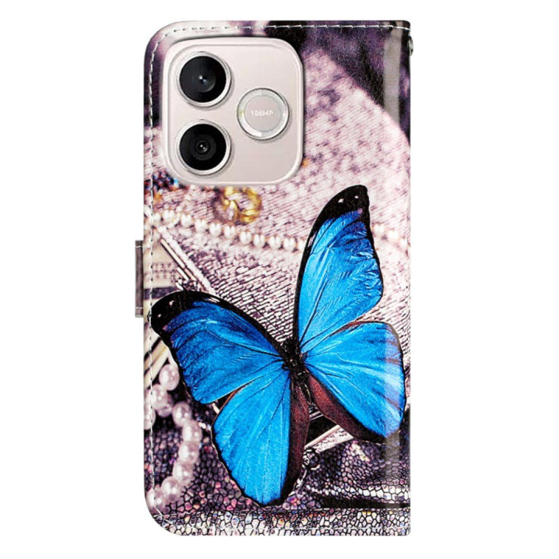Elegant blått fjärilsmotiv, kortfack, integrerat stativ och handledsrem ingår.