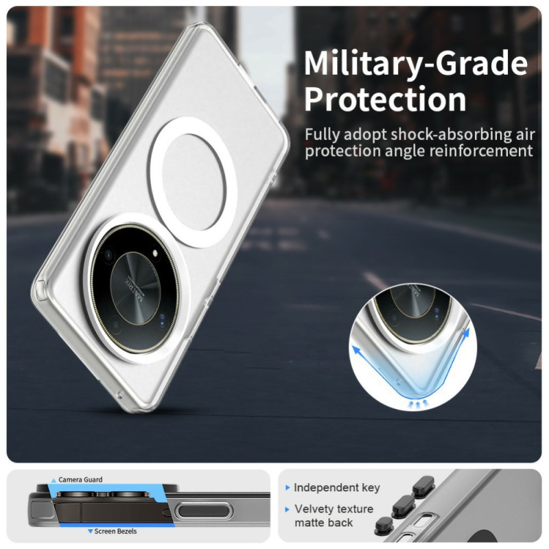 Premium hybrid skyddsskal för Honor Magic 6 Lite / X9b. Anti-drop design med integrerad magnetisk ring, kompatibel med alla magnetiska tillbehör. Förhöjda kanter för att skydda skärmen och kameran.